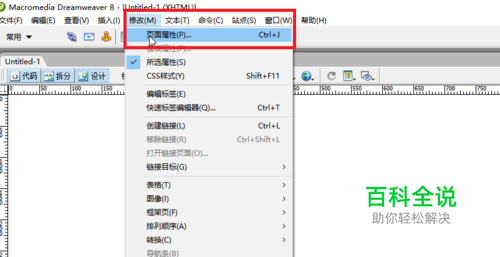 建立完毕文档之后呢,这里我们先讲述的是 设置网页属性,如下图所示我们点击修改,然后在出现的下拉选项中我们找到里面的一个页面属性,然后进行点击。