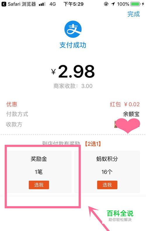 在我们到店付款之后,在手机支付宝(APP)付款页面上会出现到店支付有奖励【二选一】,一个是奖励金,一个是蚂蚁积分,点击【奖励金】。