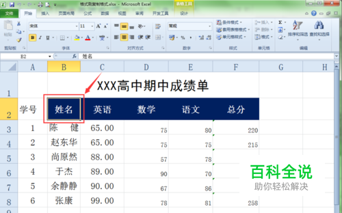 方法一:单击格式刷复制格式。此方法适合于只需要复制一次格式的情况下使用。在下表中“学号”字段的格式与其它字段的格式不一样;选择后面几个字段中的任意一个单元格,这里选择B2单元格。