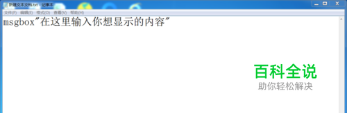 步骤二:打开新建的文件,输入“msgbox“”“。如图所示,双引号内的内容是你想显示的内容。注意:这里的双引号必须是英文状态下的双引号,否则无效!