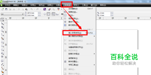 打开cdr软件,在新建的页面上点击菜单栏的“文本”——“插入符号字符”