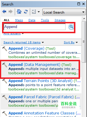 在搜索索引内容里输入“Append”,回车后会弹出有关“Append”的工具,选择“Append(Data Mangement)”工具,即可弹出想要的Append追加工具窗体。