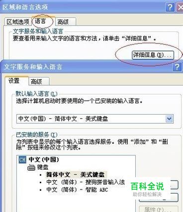 进入电脑桌面,从开始菜单-->控制面板-->日期、时间、语言和区域设置-->区域和语言选项-->然后切换到“语言”再点击“文字服务和输入与语言”下的“详细信息”,如下图: