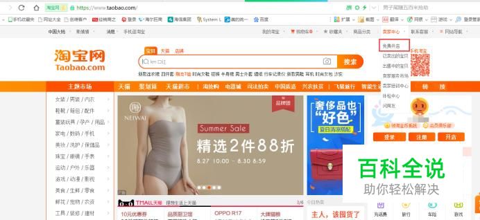 登录淘宝网的官网,点击“卖家中心”的下拉框选项“免费开店”。