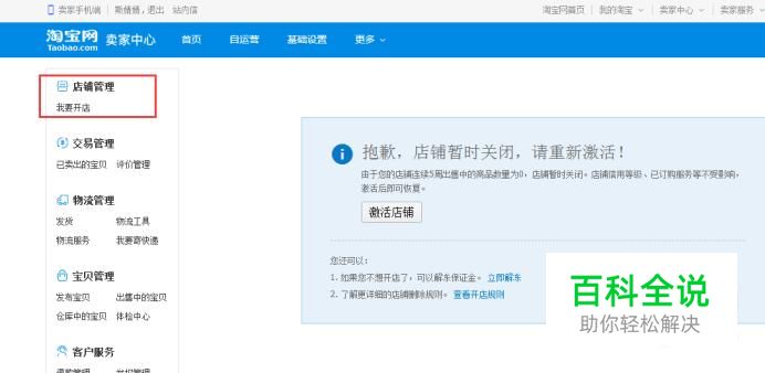 点击左侧的“店铺管理”下的“我要开店”。如果曾经开过淘宝店的用户可以选择“激活店铺”进行重新开店。