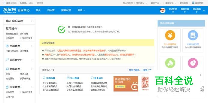 就可以成功开一家淘宝店铺了,为了完善自己的店铺,可以根据自己的需要点击右方的“加入消保服务”,完善店铺信息以及给自己店铺进行下装修都可以吸引到客流量哦。