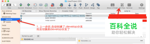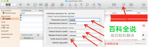 点击Git Flow 创建分支: 1. develop : 创建一个develop分支,在develop分支上进行开发 2. feature : 然后在develop上附属创建一些特性分支,比比如我们可 以为登陆功能创建一个login分支,为注册功能创建一个register分支, 为用户管 理创建一个user分支,这些功能分支都属于feature分支 3. release : 我们每次产品发布时都会将代码更新到master上进行打 包上传,然后更新打包代码到release分支上,这样就可以在以后只查 看释放 分支来查看每次上线时产品的代码了. 4. hotfix : 在代码更新到master分支后,突然发现代码中有bug,这是 我们直接创建一个热修复分支,改完这个bug后立即更新到master分 支了.