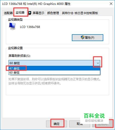 弹出的界面,我们点击监视器,之后我们点击屏幕刷新频率边上的下拉箭头,然后我们选择47赫兹,之后我们点击应用,然后我们点击确定就解决这个问题了。