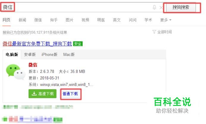 首先,我们打开我们电脑桌面上的浏览器,然后我们在搜索引擎中输入微信,然后我们点击搜狗搜索,弹出的界面,我们点击普通下载;