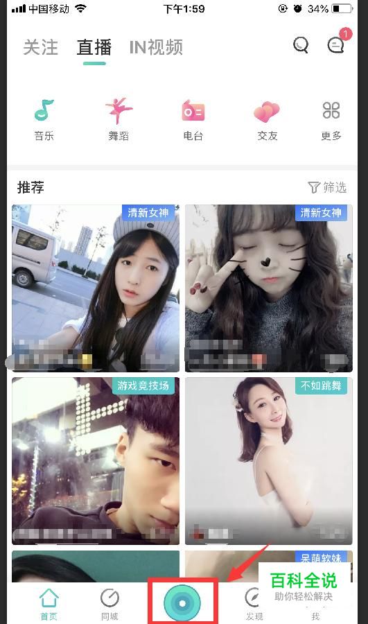 进入“映客”之后,会有直播推荐,如图所示,点击下方箭头所指的图标
