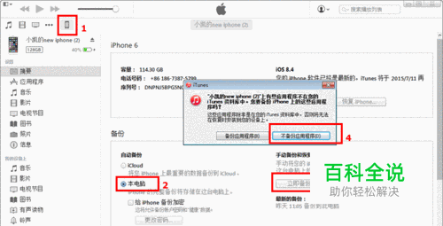 1. 我们需要先运行Itunes软件,并将手机与电脑进行连接,然后依次点击Itunes窗口左上角的手机图标,然后选择“本电脑”并点击“立即备份”按钮,然后在弹出的窗口中点击“不备份应用程序”,如下图所示,我们只需依次点击1,2,3,4处红框所标示的位置即可。