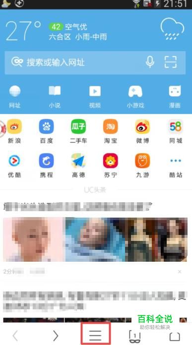 首先,我们打开我们的手机,然后我们打开手机桌面上的UC浏览器,之后我们点击下方中间的菜单按钮;