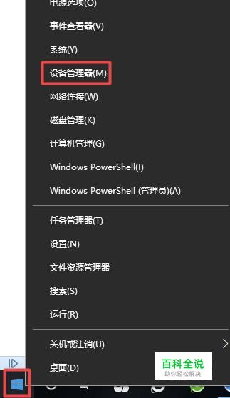 首先,我们右击电脑桌面左下角的微软按钮,弹出的界面,我们点击设备管理器;