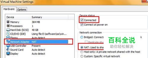 这时新的问题是:我要频繁上传下载文件,以及QQ聊天记录、Foxmail信件的保存,虽然可以通过Vmware的共享文件夹来解决,但毕竟不方便。我就想,虚拟机能通过桥接或NAT等方式通过物理机来上网,反之亦然呼?子曰:然! 二、设置方法: 也许正如你所想,以上说的都是废话,下面来点硬菜: 1. 设置虚拟机的网卡共享方式:依次点击【虚拟机(VM)】 -【设置(Settings)】,设置网卡为NAT方式,如图: