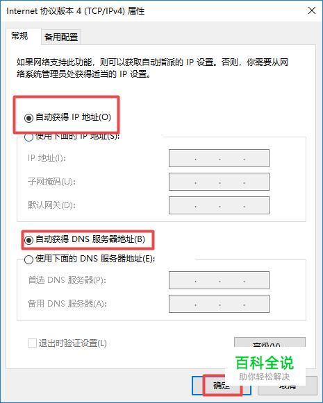 弹出的界面,我们将IP地址和DNS地址全部设置成自动获取,之后点击确定就可以了。