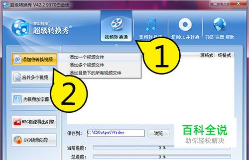 点击 “视频转换通”后点击 “添加待转换视频”,在弹出菜单中选择相应添加方式,这里选“添加一个视频文件”。在文件窗口中选择视频文件,点击打开。
