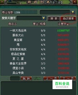 2、点击买东西打开商店列表,然后点击“高级搜索”按钮: 弹出一个高级搜索功能界面,有装备和药品栏切换,如下图所示: