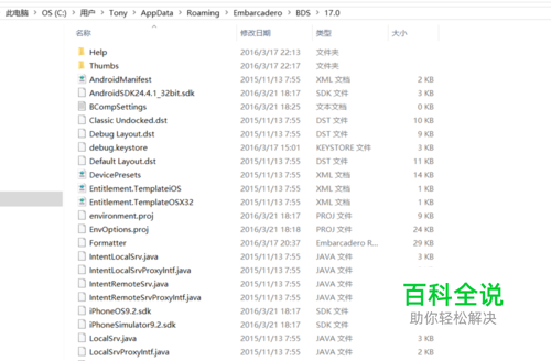 打开C:\Users\用户名\Documents\Embarcadero\Studio\SDKs文件夹,删除有问题的SDK文件夹。 (注:图片中用户名是Tony,换成您的用户名,下同)