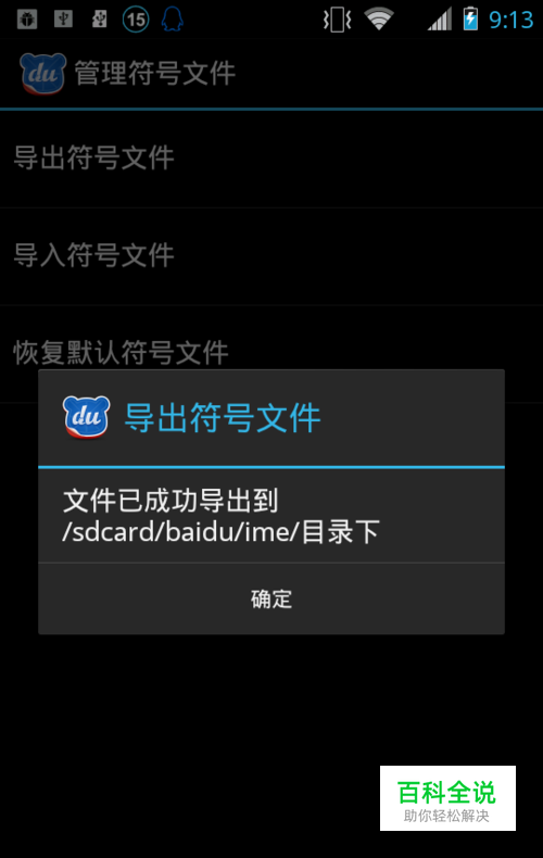 打开百度输入法,按照步骤“高级设置------->管理符号文件------->导出符号文件”点击导出符号文件,导出sym.ini文件。