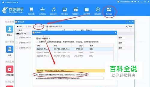 升级前一定要做好数据备份。在电脑上安装同步助手,并用数据线连接设备到电脑,切换到“更多功能 >> 备份还原 >> 创建备份”,建议选择创建新备份,做一次完整的整机备份。