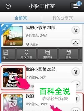 小影工作室。在这里可以启动一个新视频的拍摄和快捷的预览编辑已拍摄的视频。同时也可以对已拍摄的视频进行导出、更改地理位置、重命名、删除等操作。单击视频缩略图可继续拍摄镜头,若单击整个视频行可对视频直接编辑预览。
