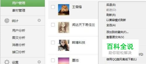 第一步:老马这里用搜狗浏览器登录公众平台,然后打开“实时消息”或者“用户管理”这两个页面,或者只打开“用户管理”页面也可以的。接着在“用户管理”页面用鼠标右键点击“审查元素”,如图所示: