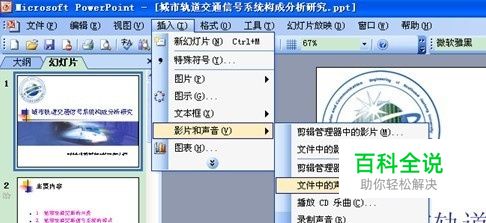 打开ppt文件,选择“ 插入”——“ 影片和声音”——“ 文件中的声音”。