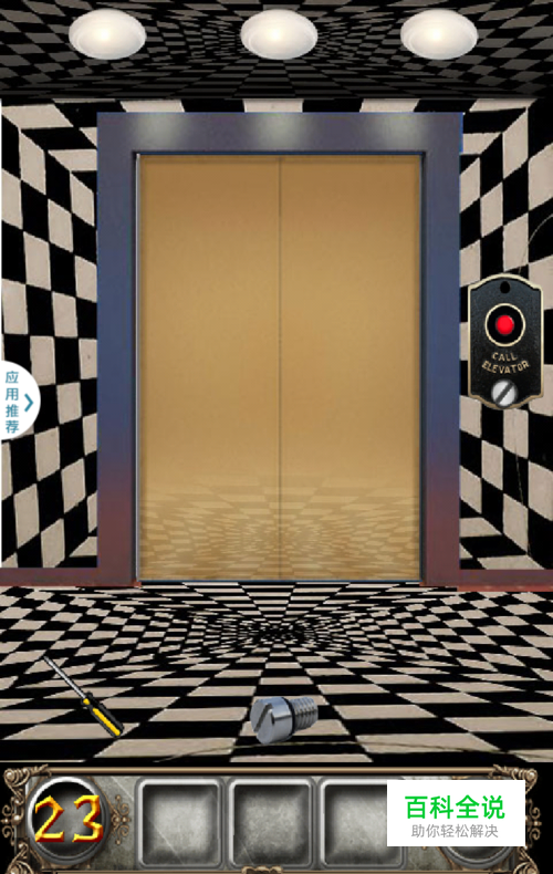 23关,捡起螺丝和螺丝刀,先将螺丝装入电梯按钮,再用螺丝刀扭紧,再点一下电梯按钮