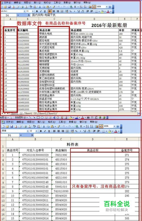 打开电脑,点开Excel,打开数据库文件和需要引用数据的文件。 现以一份电子账册的料件为例:企业在海关备案了552个不同的商品,这552个"商品名称"有"备案序号",另一份料件表文件只有"备案序号",我们想根据"备案序号"从总料件数据中引出所需要"商品名称"。
