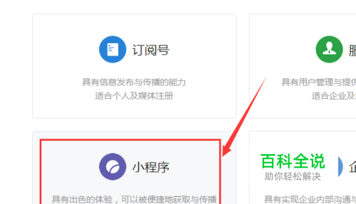 选择小程序。注册页面有很多分类。可以注册订阅号、服务号、企业号、小程序,根据自己的需求进行选择设置。