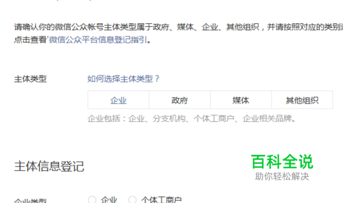 选择主体类型。根据自己的性质选择合适的主体类型,如果不清楚如何选择,可以点击连接如何选择主体类型参阅选择。