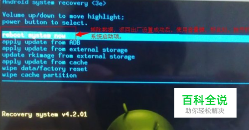 一、我们先了解下reboot system now的意思,翻译成中文意思是“重新启动系统”。通常是出现在刷机的recovery模式下面。也就是说,是不是我们开机时不小心按错了组合键让手机自动进入到了刷机模式,可以使用音量键选择,按电源键确定,直接选择第一项reboot system now,手机就会自动启动。这个动作对手机并无损害,可以尝试一下。