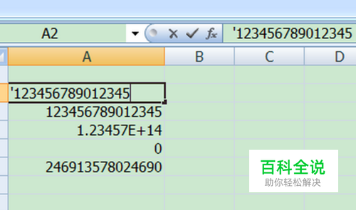 输入撇号来显示长数字的方法,有一点不足之处,就是这个单元格中的数字不是数字格式,所以不参加函数计算。在需要统计的表格中就不实用了。