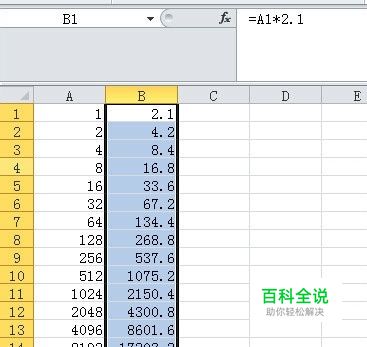 这样,单元格B1:B15的数据就为对应A列数据乘以2.1的结果了
