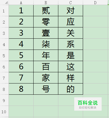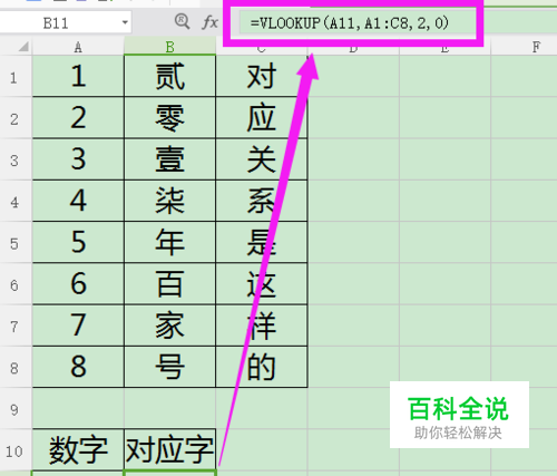 假如现在,我们需要来查找首列中“5”对应第二列中的”哪个数值”。 我们在B11输入的函数是=VLOOKUP(A11,A1:C8,2,0)得到的对应字就是“年”哦!