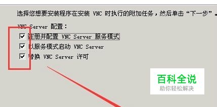 然后我们到达安装模式这里,我们那个倒三角形的下拉框,选择“自定义安装”,在“VNC server”前面的方框中打勾,确定勾选后点击下一步。 VNC server就是安装服务端的意思,因为我们要控制这台电脑,相当于这台电脑要为我们服务,这样就好理解了!