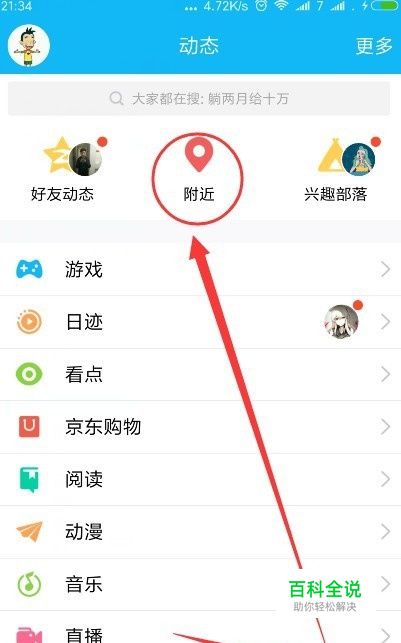 点开手机QQ主面板,动态里面有个附近,先到附近里面