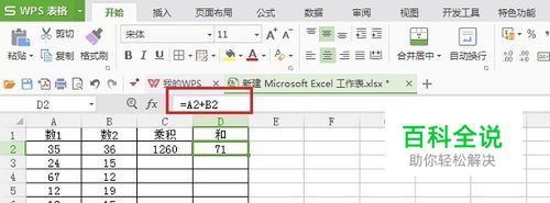 第二步点击c2,然后直接在编辑栏上面输入“=A2*B2”,按回车键,结果就出来了,同样点击D2,然后在编辑栏上面直接输入"=A2+B2",按回车键,同样结果就出来了,如下图所示: