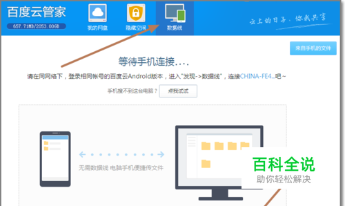 进入数据传输界面。提示需要两步,首先需要在电脑上启动百度云管家5.0及以上版本,并且百度云管家也要进入“数据线”功能界面,然后手机上就可以点击如图的“探测电脑”。