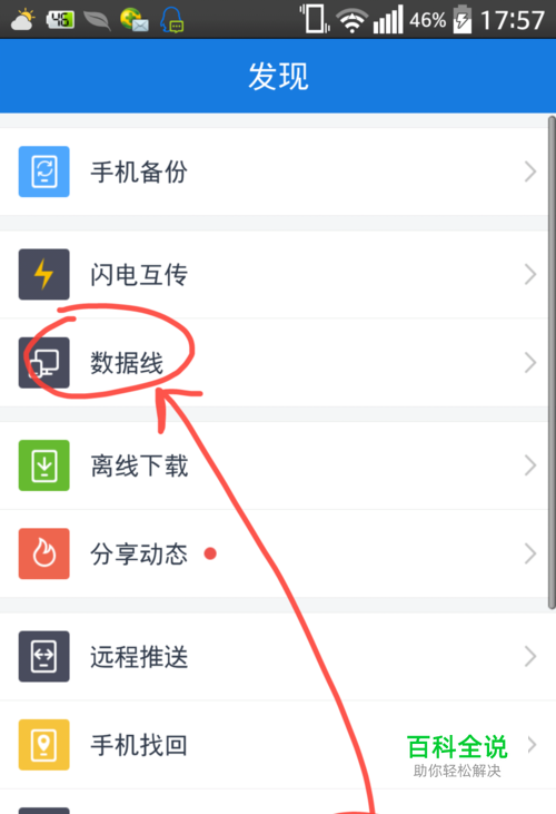 先进入手机百度云,点击底部“发现”,在功能菜单中选择“数据线”。