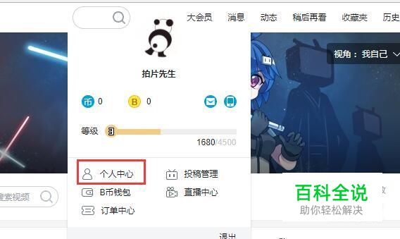 登陆哔哩哔哩账号进入后台,鼠标移动到头像上,选择个人中心