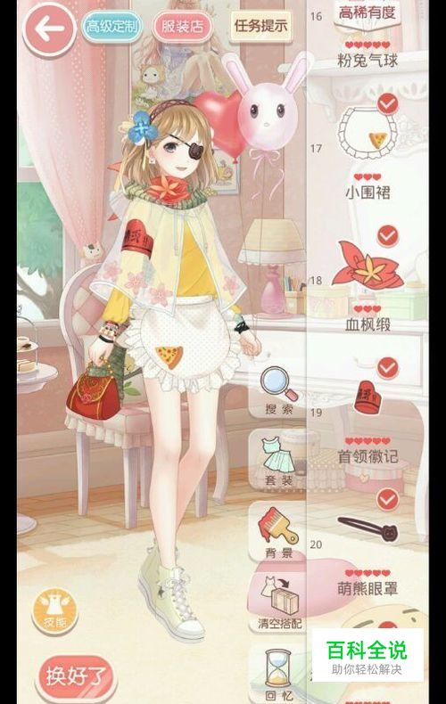 饰品及手持物: 粉兔气球,小围裙,血枫段,首领徽记,萌熊眼罩,洗沙.