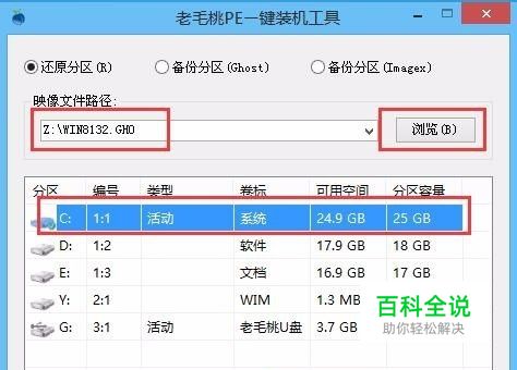 点击“浏览”将系统镜像添加进来,在磁盘列表中点击选择c盘,最后点击“确定”即可,如图所示
