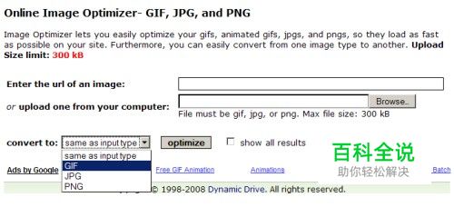 Dynamic Drive在线图片优化器 该在线图片优化器允许你优化不同的文件格式,比如GIF、JPG和PNG。你既可以从本机上传图片,也可以像Smush.it那样粘贴图片的URL。该工具可以优化并转换你的图片为不同的文件类型。该工具的限制是每次一张图片,每张图片不大于200K。