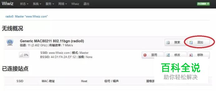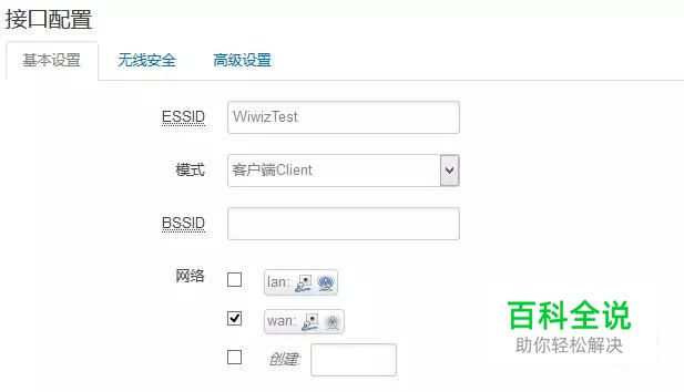 点击“添加”按钮。然后,按下图设置一个新的无线网络。 这里需要注意: (1) 基本设置标签页内的“ESSID”应填写为上级WiFi的SSID。 (2) “模式”项必须选择“客户端Client”。 (3) “网络”项选择“wan”。 (4) 无线安全标签页内的各项表示上级WiFi的加密方式,应与上级WiFi的实际情况一致。 (5) 上述设置完成后,点击“保存&应用”。