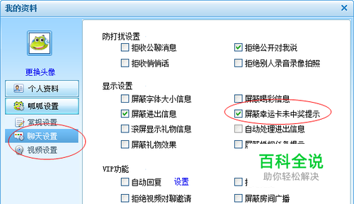然后点击呱呱设置→聊天设置选项卡,在右侧勾选屏蔽幸运卡未中奖提示选项,如图所示: