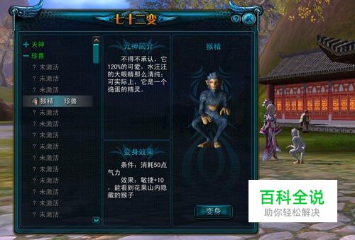 通过元神符学会了变化方法之后,打开72变界面(快捷键V),可以查看到自己学会的72变属于哪一种类,在“已激活”分类中则能统一看到自己已经学会的所有变化。选择其中的一种,点击“变身”按钮,就可以华丽变身了。