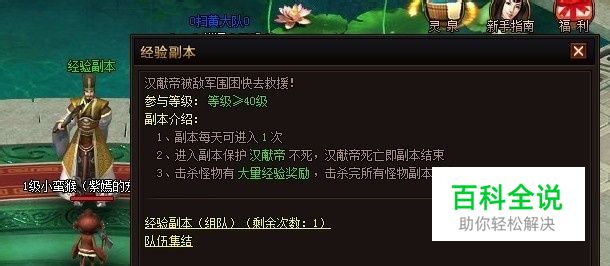 9377群雄争霸第一个经验副本在40级就开启,难度小经验也多,进入副本后击需要守护NPC汉献帝不死,玩家抵挡一波又一波怪物坚持30分钟即可副本结束;每击杀一只怪物都可获得大量经验,强烈建议吃个多倍经验丹后可经验加倍,完成副本后经验很多哦;进入方式为在荆州城NPC40级经验副本入口处进入: 进入后将会不断有一波波怪物前来攻击NPC汉献帝和玩家,系统将赠送4个守卫来协助你击杀怪物。