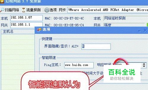 第一次运行幻境网盾会弹出一个“选项”设置窗口,这里可以设置界面隐藏快捷键、智能限速的设置、ARP防火墙等。智能限速的默认响应时间是100ms,对于懒人或者小菜鸟来说,直接使用默认值就可以了。