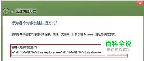 在键入对象的位置中复制“taskkill /F /FI "USERNAME eq PChome" /FI "IMAGENAME ne explorer.exe" /FI "IMAGENAME ne dwm.exe"”粘贴到对象窗口,“下一步”。